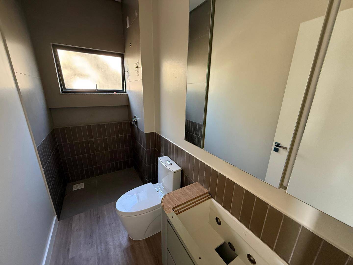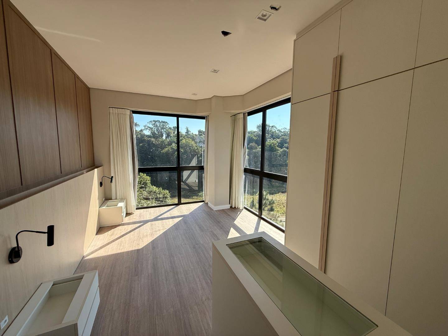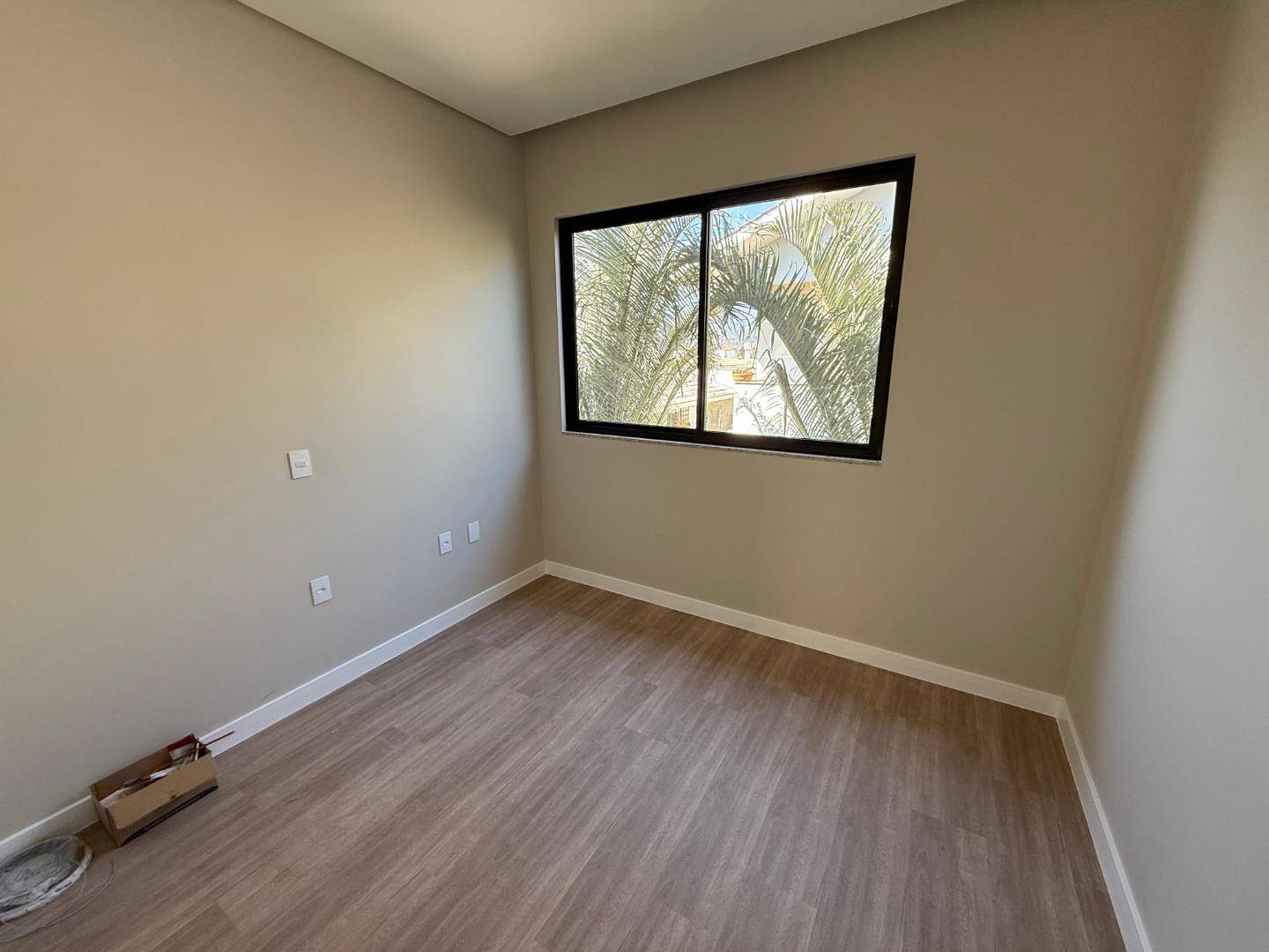 Acabamento com massa corrida, gesso e piso vinílico.