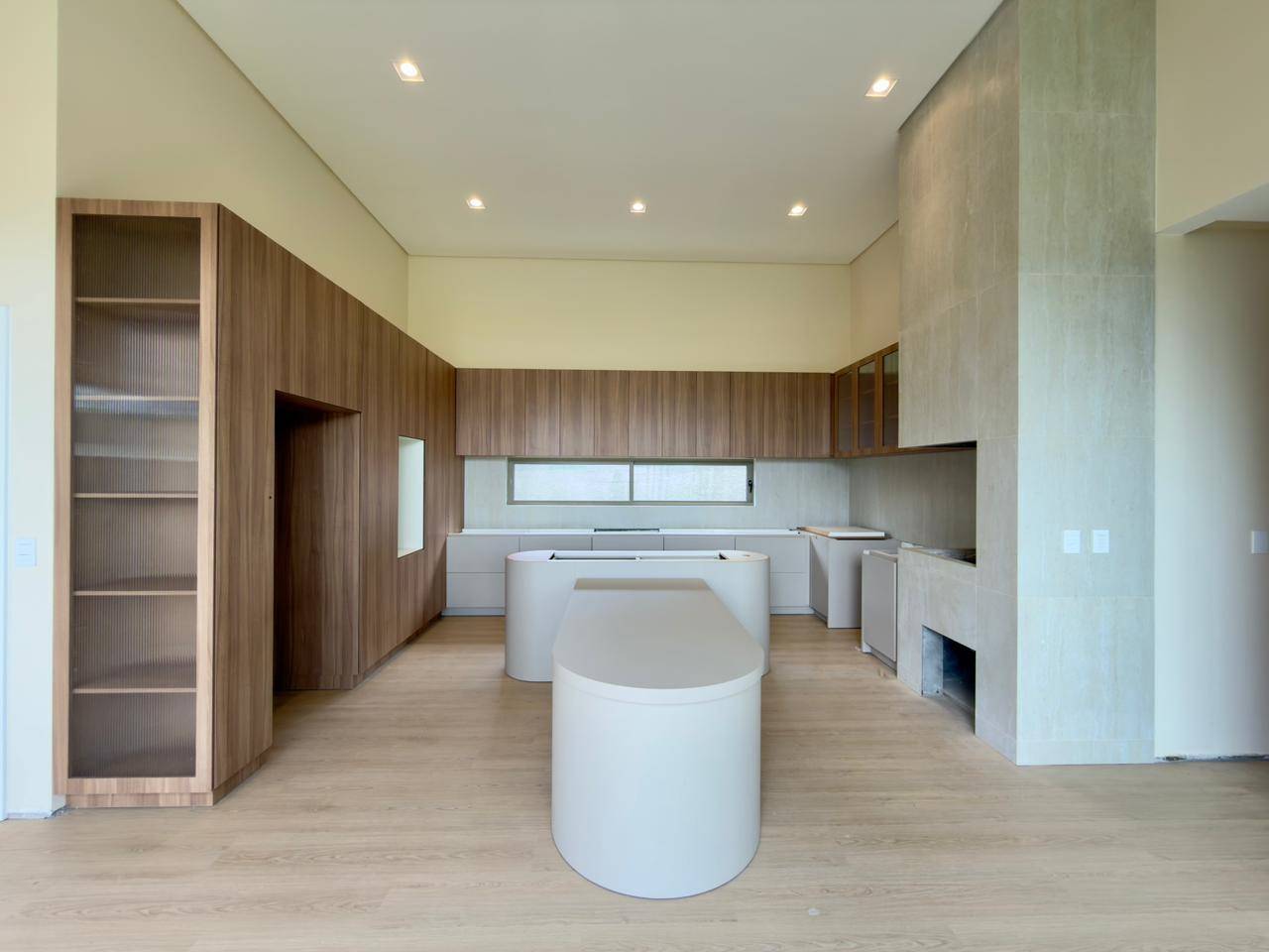 Cozinha integrada, equipada com móveis planejados e churrasqueira