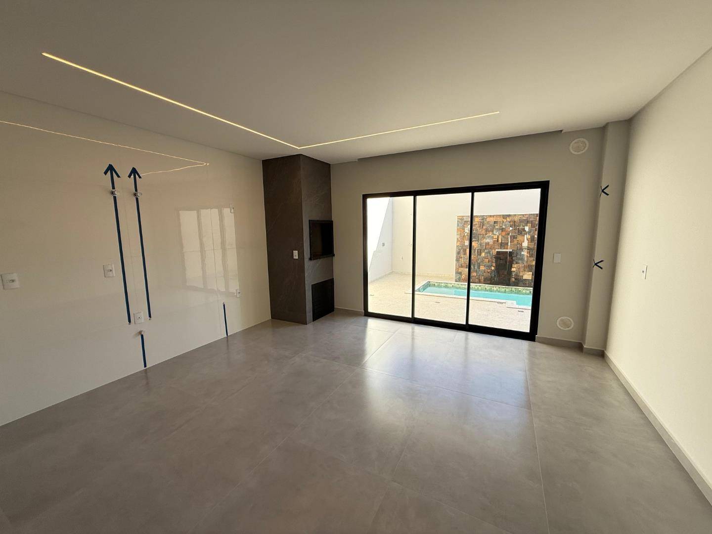 living com churrasqueira integrado e de frente para piscina